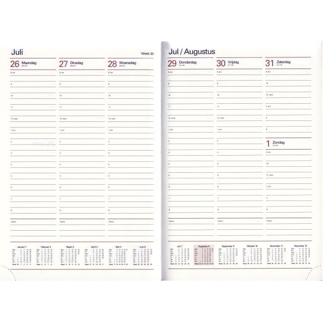 Gebonden agenda met harde kaft, met bladwijzer/leeslint, 128 pagina’s, voorzien van afscheurbare perforatiehoeken, 1 week per 2 pagina’s, een beknopt jaaroverzicht op elke pagina, een uurindeling van 08.00 tot 20.00 uur, jaarplanners van 2026 èn 2027 inbegrepen en ruimte voor notities. Formaat: 21 x 26,8cm