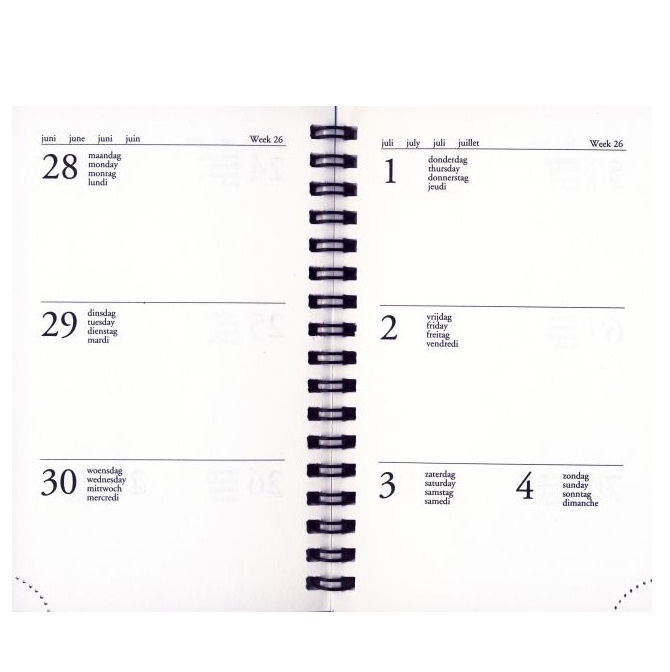 Agenda met harde kaft – Door ringband volledig omklapbaar – 128 pagina’s – 1 week per 2 pagina’s – Voorzien van perforatiehoek – Jaarplanners van 2026 èn 2027 inbegrepen – ruimte voor notities Formaat: 15,5 x 10,5 cm