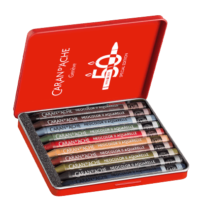 Ter ere van het 50-jarig jubileum presenteert Caran d’Ache vijf Special Editions, verrijkt met 15 nieuwe kleuren, gegroepeerd in vijf thematische paletten: Pop, Lush, Portrait, Pastel en Dark. Elke doos met 10 kleuren bevat drie van de 15 nieuwe tinten.
