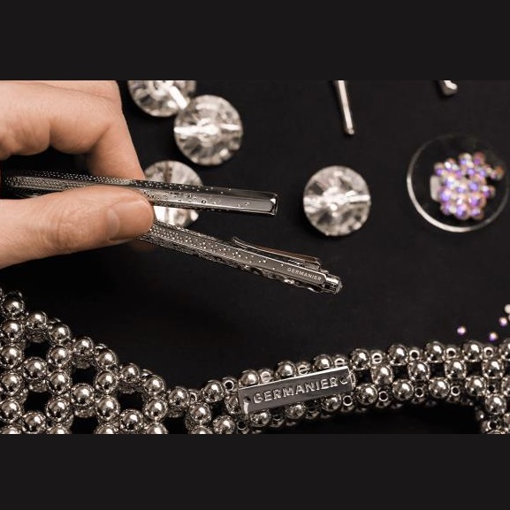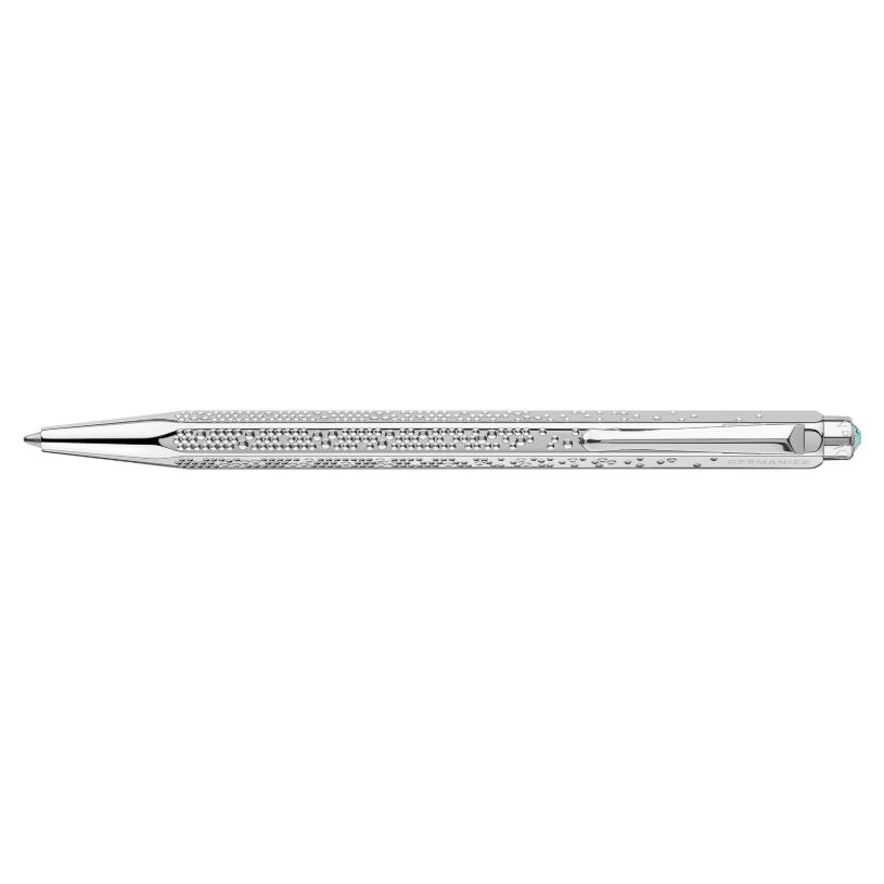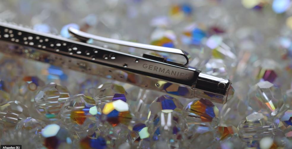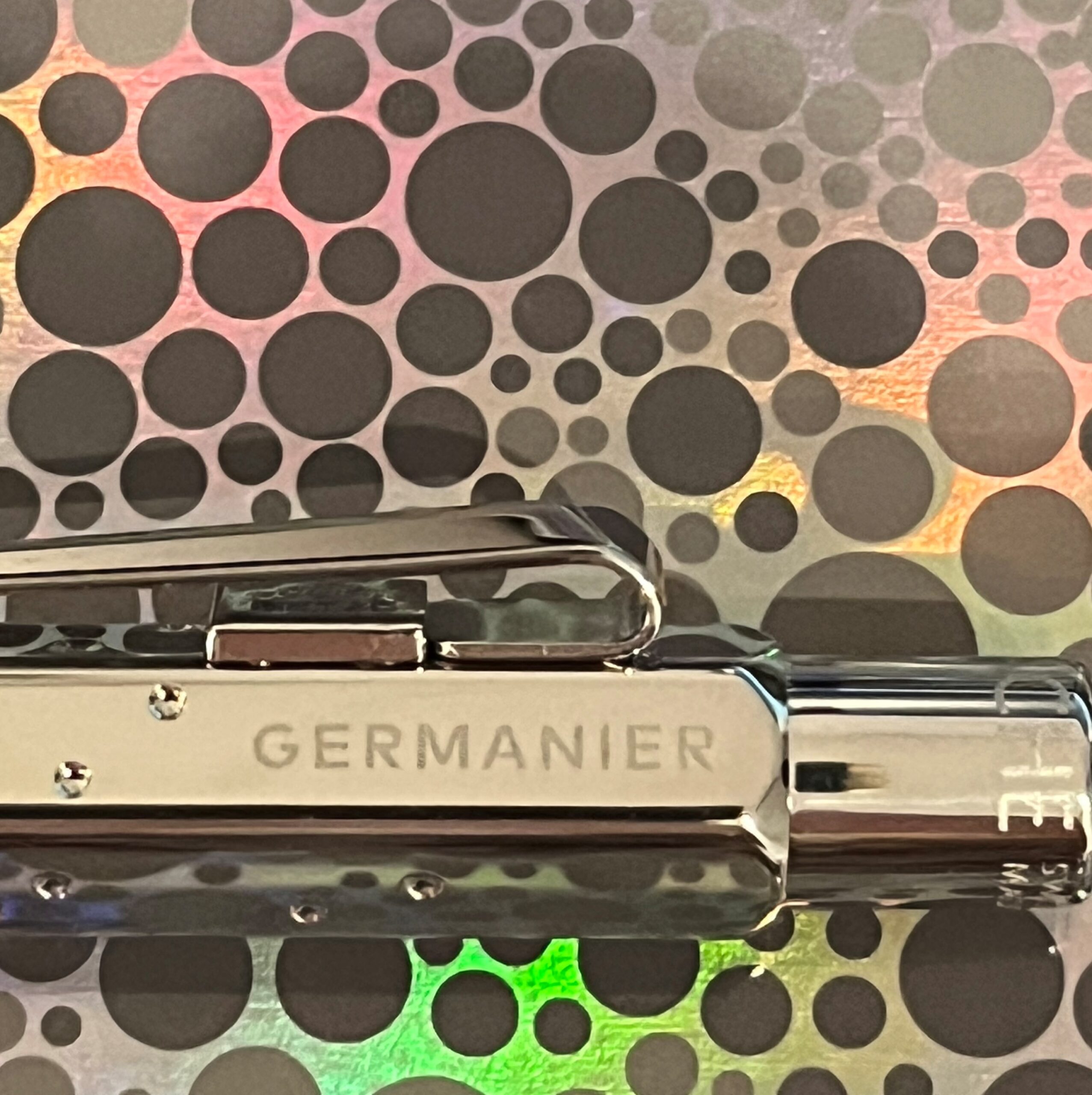 De Ecridor™ Germanier balpen combineert tijdloos vakmanschap met gedurfde duurzaamheid. Hij is voorzien van een guilloché, geïnspireerd op een parelweefpatroon, en de bovenkant van de drukknop is versierd met een holografisch kristalglas.