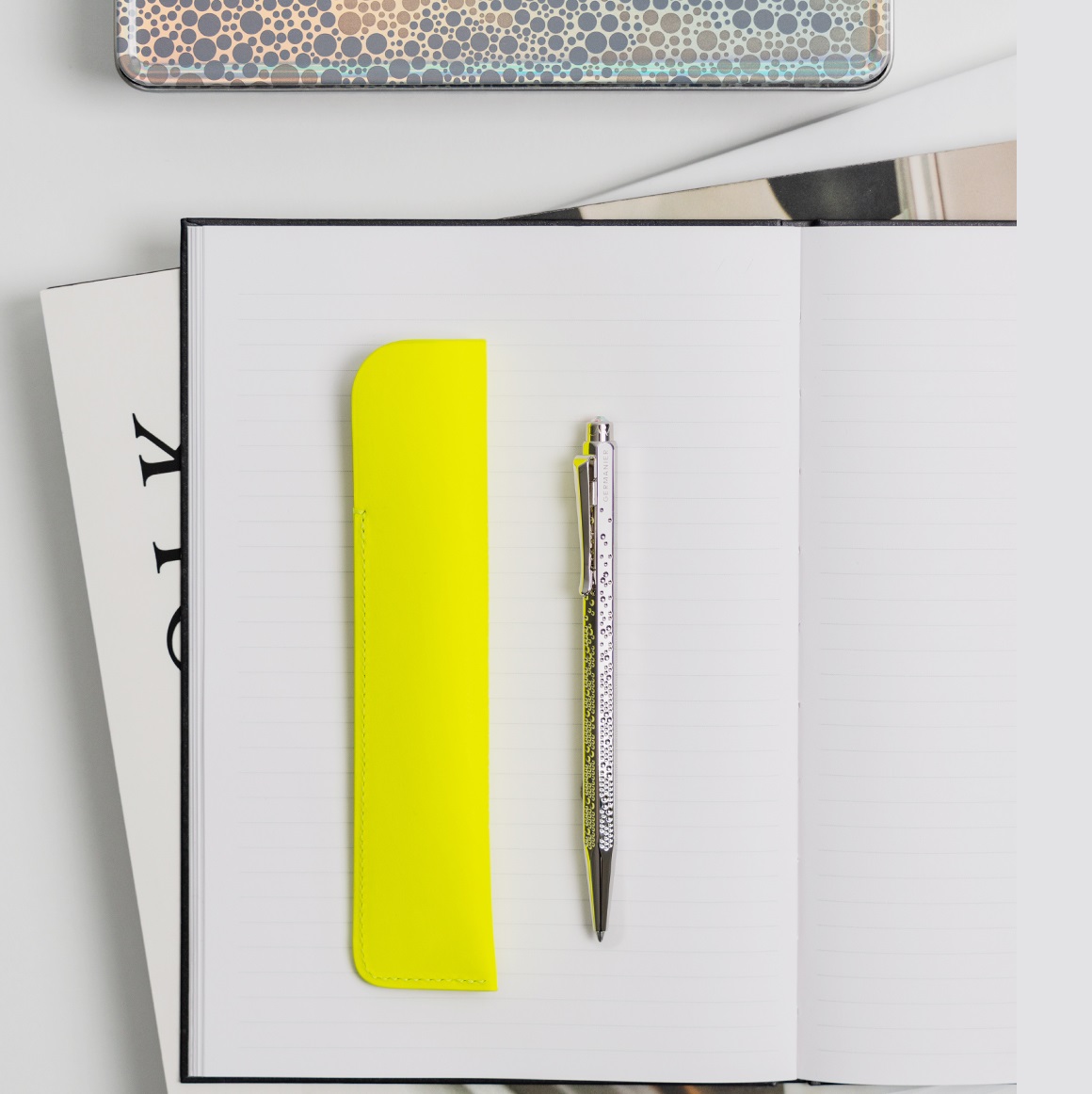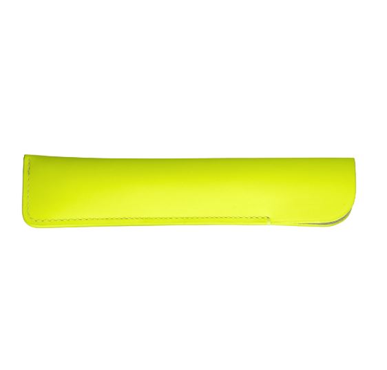 Deze pen wordt geleverd met een neongeel leren etui, afkomstig van restanten van luxe modehuizen, een opvallende knipoog naar Germaniers onwrikbare toewijding aan upcycling.
