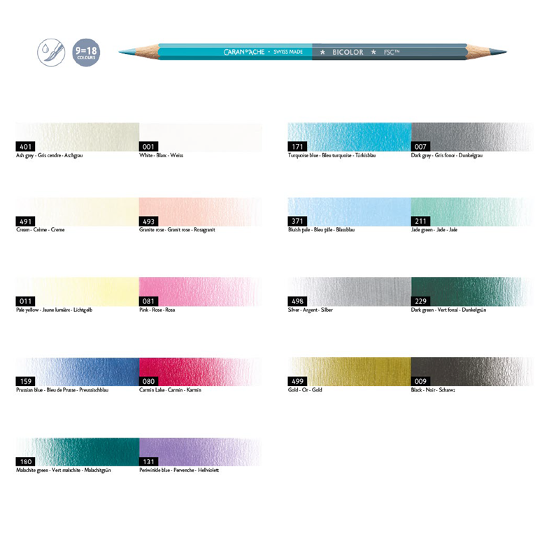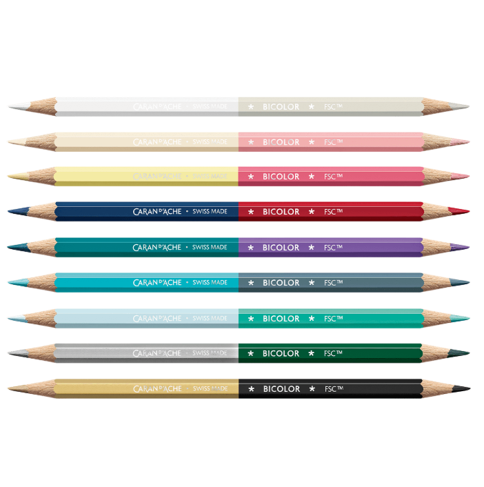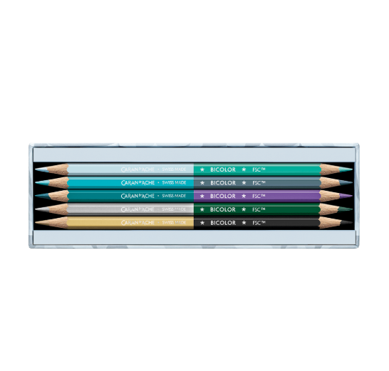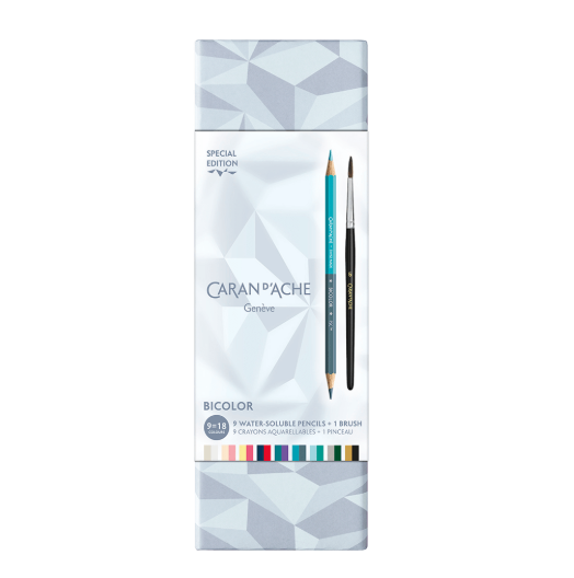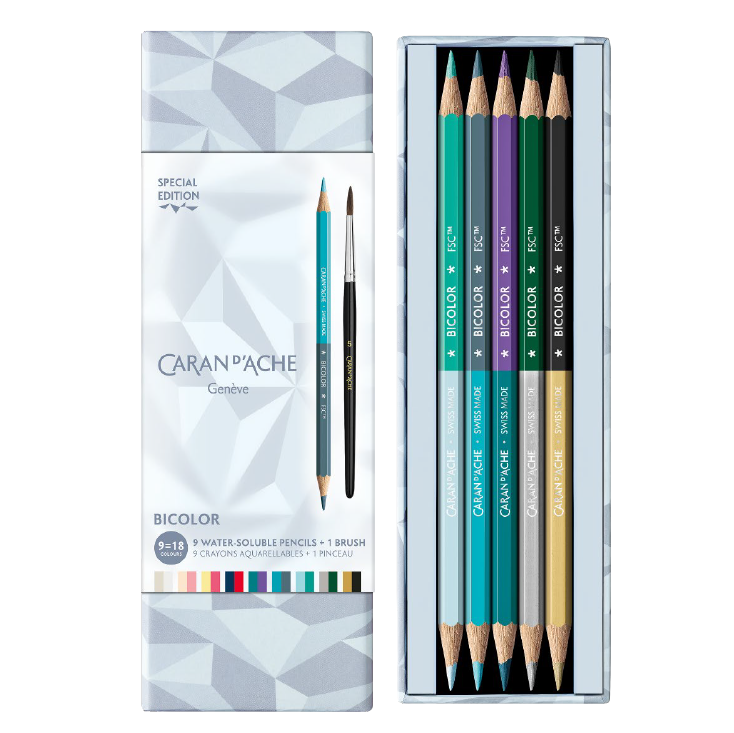 Aan de Fine Art-kant presenteert Caran d’Ache een set van negen tweekleurige potloden en trekt hij de iconische slijpmachine in iriserend ijsblauw aan.