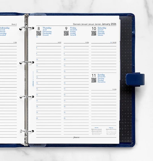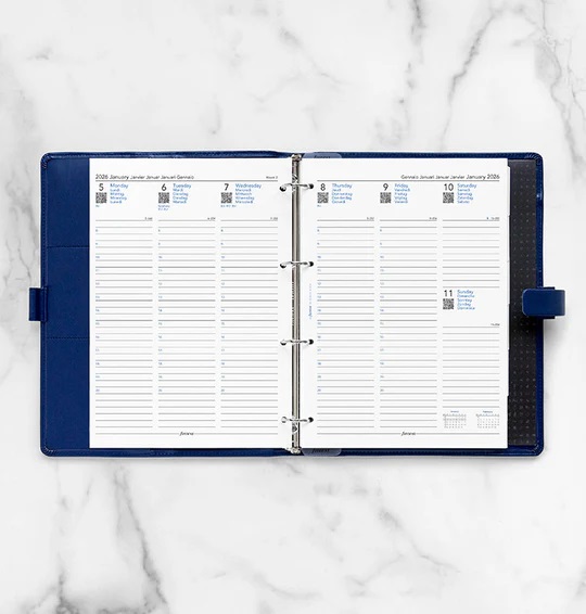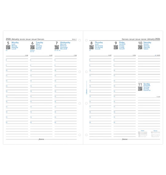 A4 agenda-inhoud, 1 week per 2 pagina’s – 2026 – wit – tijdsindeling van 8.00 tot 20.00 uur voor afspraken – in kolommen- 5-talig – Formaat: 21 x 29,7 cm