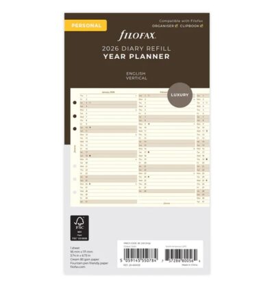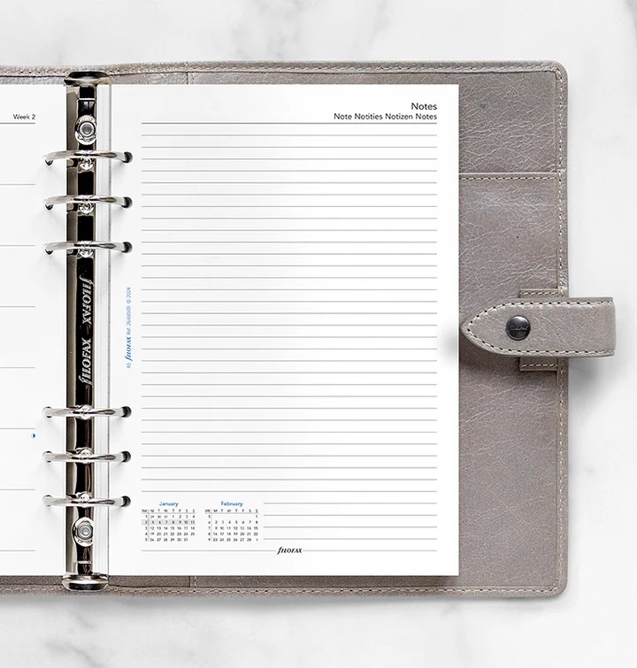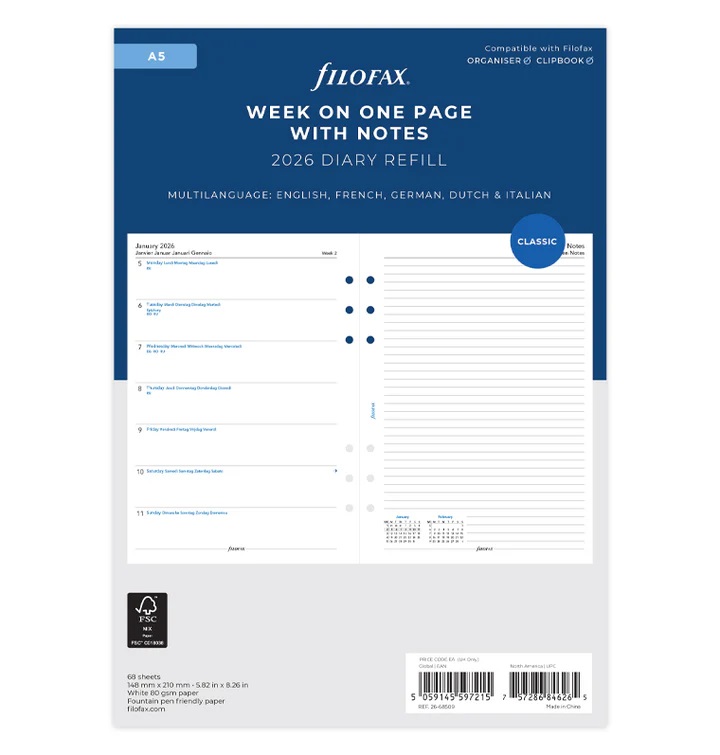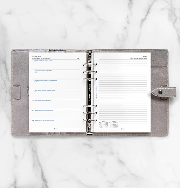 Filofax A5 agenda-inhoud, 1 week op pagina met als specialiteit dat de bladzijde ernaast notitieruimte is, 5-talig, 2026, wit, 14.8 x 12 cm