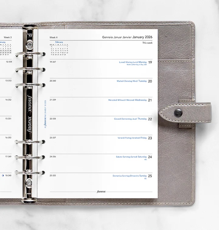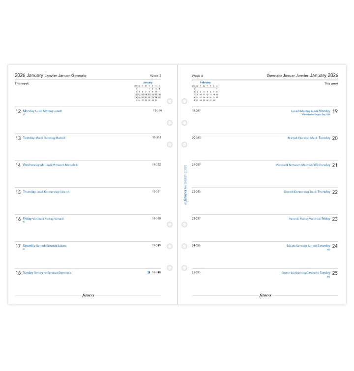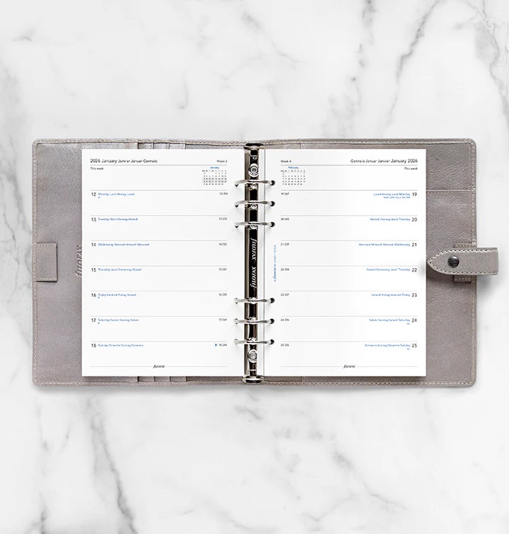 Filofax A5 agenda-inhoud, 1 week per pagina, 2026, 4- talig, wit, Formaat: 15 x 21 cm, Organiseer twee weken in één oogopslag met deze A5 week op één pagina 2026 agenda. Past ook in het clipbook.