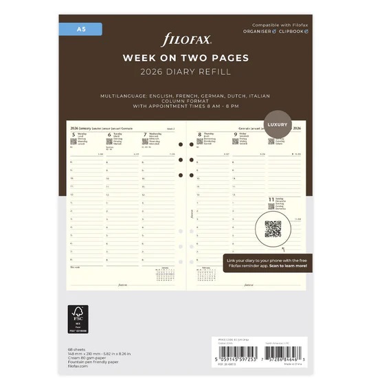 A5 agenda-inhoud, 1 week per 2 pagina’s – 2026 –  tijdsindeling van 8.00 tot 20.00 uur voor afspraken – in kolommen- 5-talig – cotton cream – Formaat:15 x 21 cm. Past ook in het clipbook.