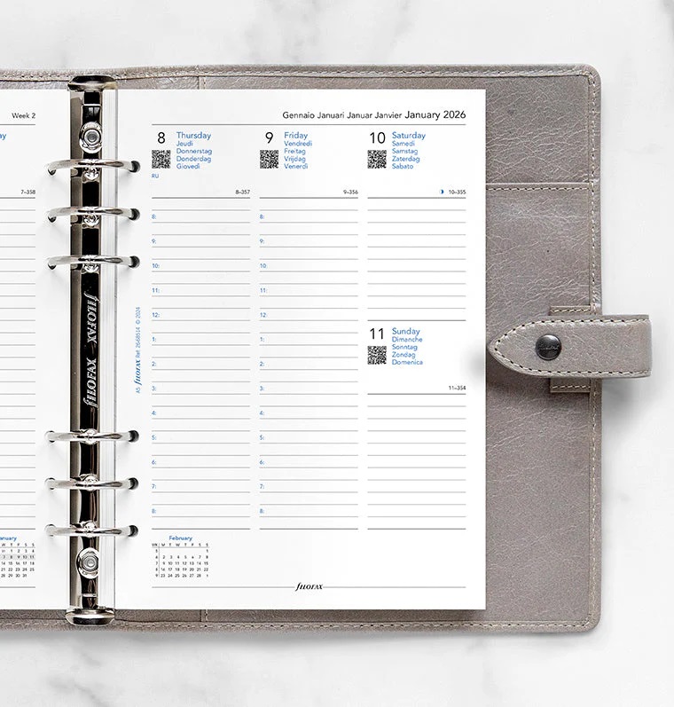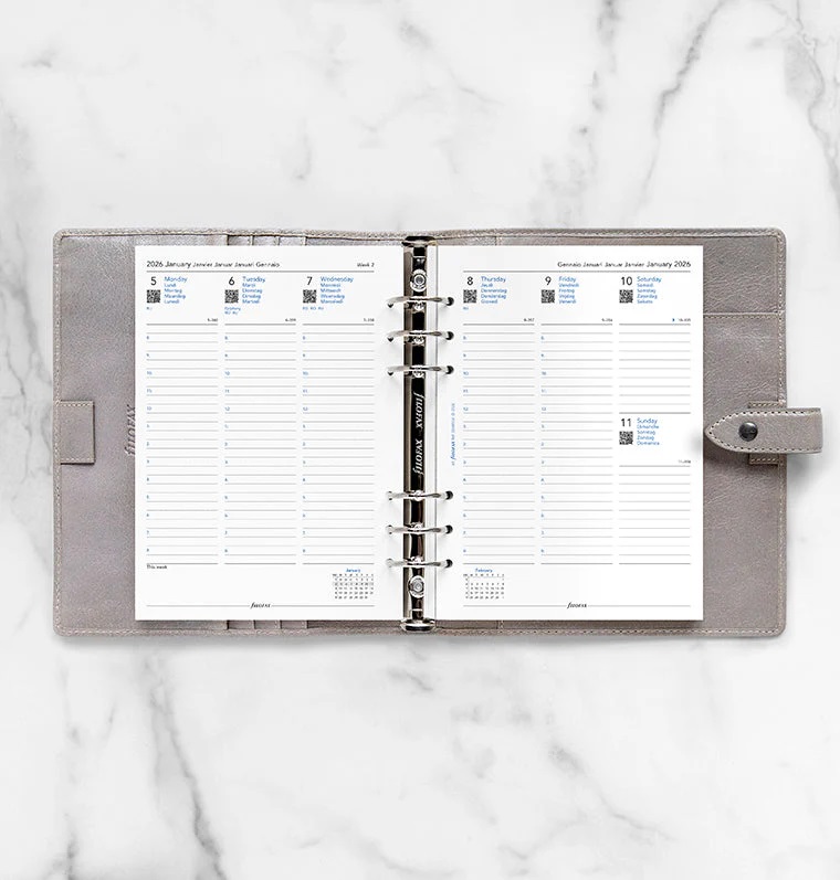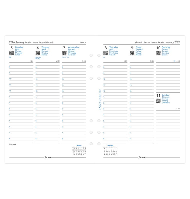 Beheer uw week inéén oogopslag met deze 1 week, 2 pagina’s agenda in kolomformaat met afspraken, beschikbaar in vijf talen.