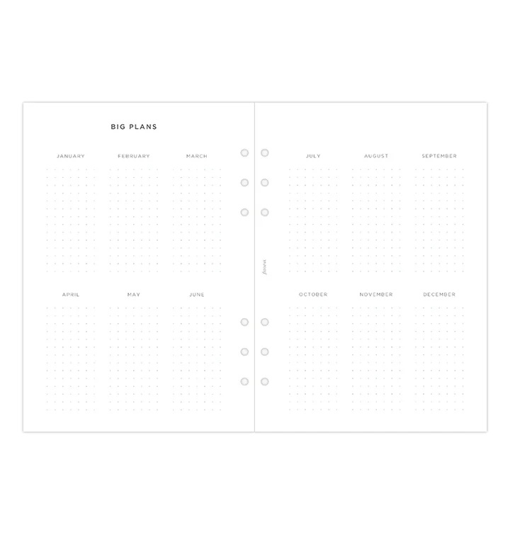 Geef uw plannen een persoonlijk tintje met onze Minimal Dated navulling. Deze eigentijdse A5 vulling heeft een verticale week indeling en strakke, witte pagina’s voor eindeloze organisatie. Voorzien van een “Hoort bij” pagina ontworpen voor het toevoegen van een persoonlijk tintje. Kalenders van het huidige en het volgende jaar zijn opgenomen om u de kans te geven vooruit te plannen, terwijl de vriendelijke dashboard pagina’s uitnodigen tot het begin van een nieuwe maand. Ontdek het gedeelte “Grote plannen” met stippelpagina’s voor maandelijkse doelen. Aan het eind van elke maand vindt u ook gestippelde en gelijnde pagina’s, perfect voor uw notities en doodles. Meertalig. Vulpenvriendelijk papier.  Formaat:15 x 21 cm. Past ook in het clipbook.