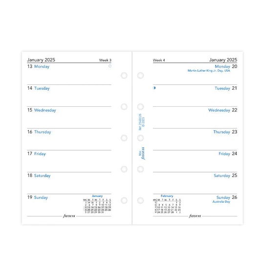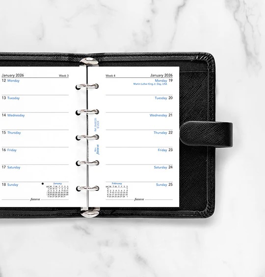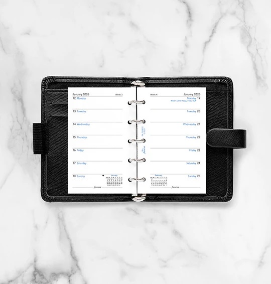 Filofax mini agenda-inhoud, 1 week per pagina, 2026, Engelstalig, 6,7 x 10,5 cm. Bekijk twee weken in één oogopslag met deze weekagenda-indeling op één pagina 2026 agendavulling.