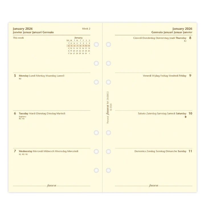 Filofax Personal agenda-inhoud 1 week op 2 pagina’s, cotton cream, 5-talig, ongelinieerd, 2026, 9,5 x 17,1 cm