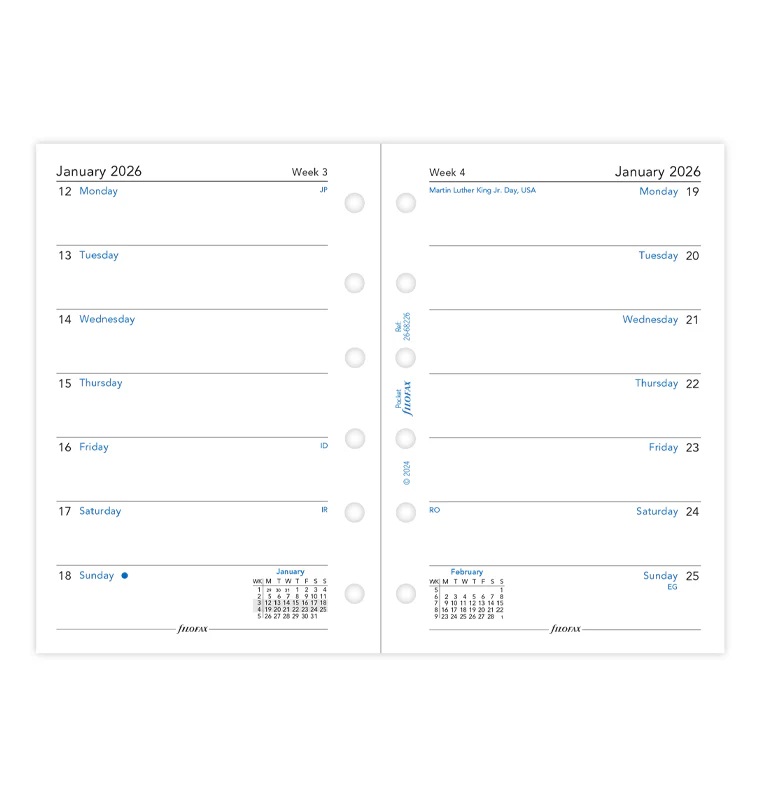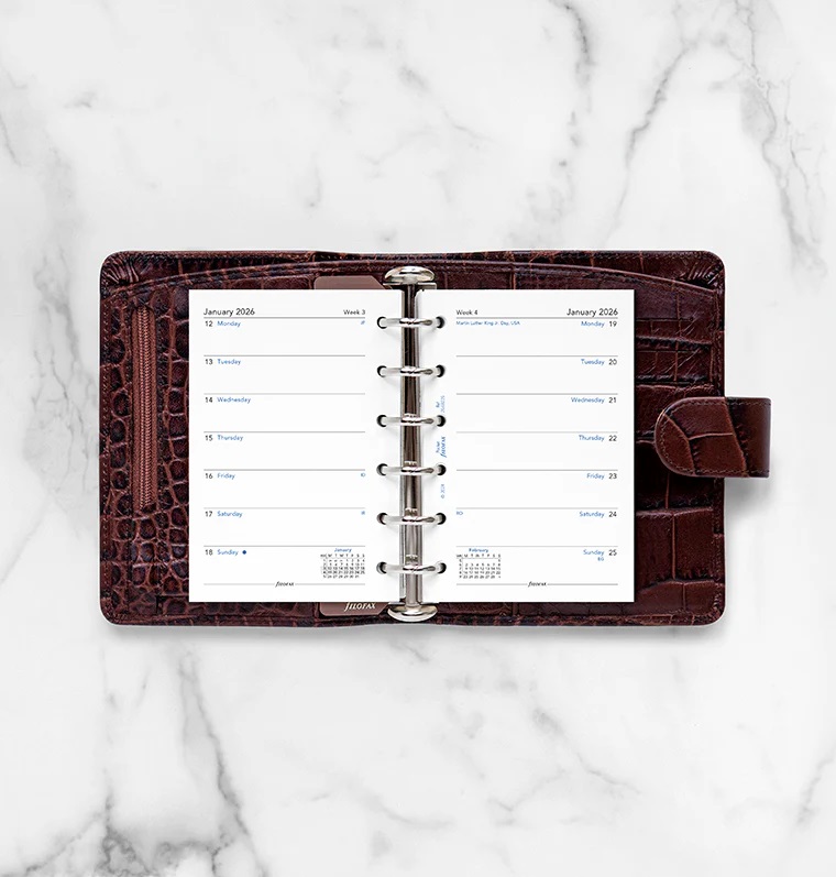 Filofax pocket agenda-inhoud, 1 week per pagina, 2026, Engelstalig, 8 x 12,5cm. Bekijk twee weken in één oogopslag met deze weekagenda-indeling op één pagina 2026 agendavulling.