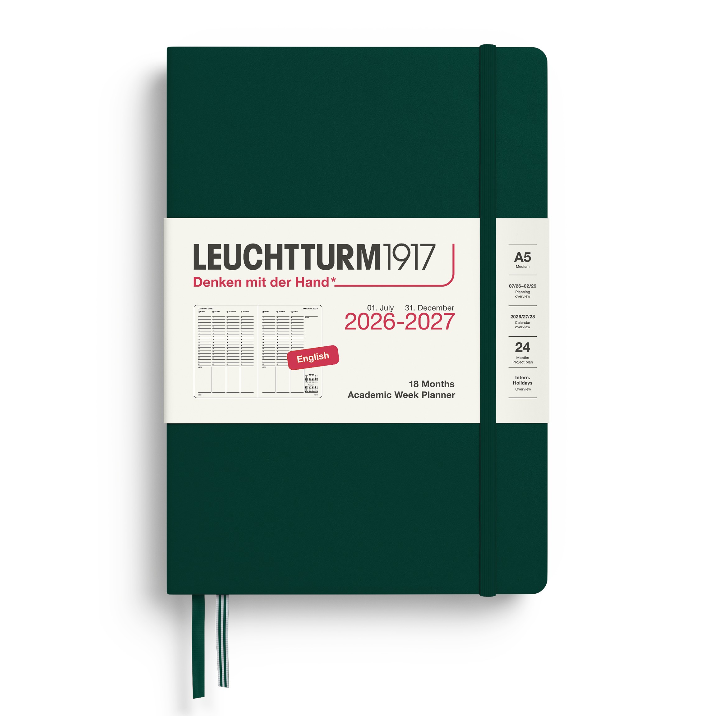 Academische weekplanner 2027, 18 maanden, van juli 2026 – december 2027, één dubbele pagina per week, inclusief alle bekende overzichten en details. Uitbreidbaar vak in de omslag en uitneembare vellen voor notities