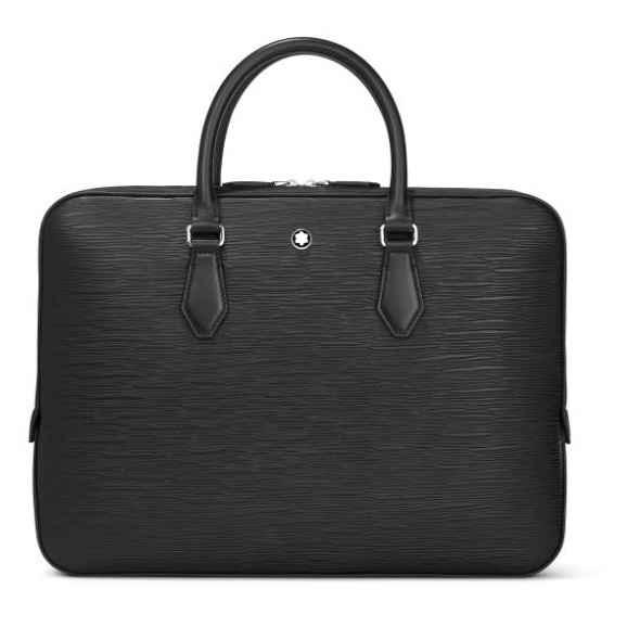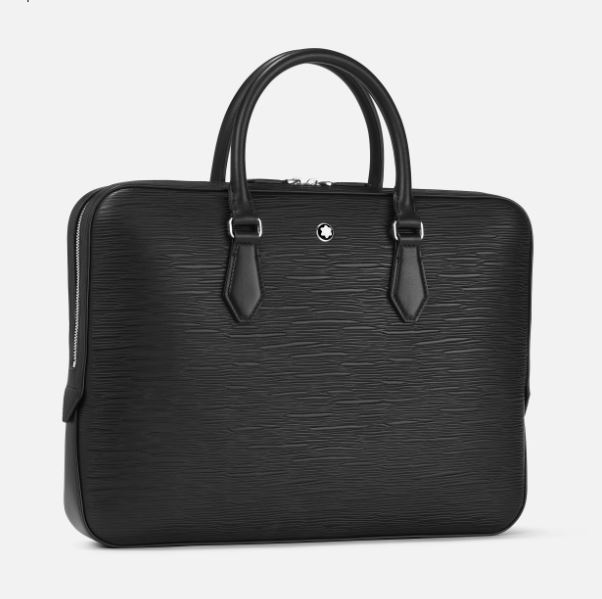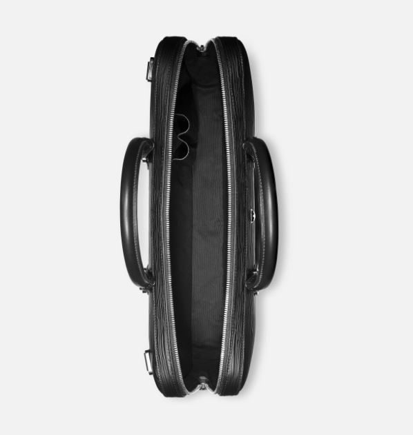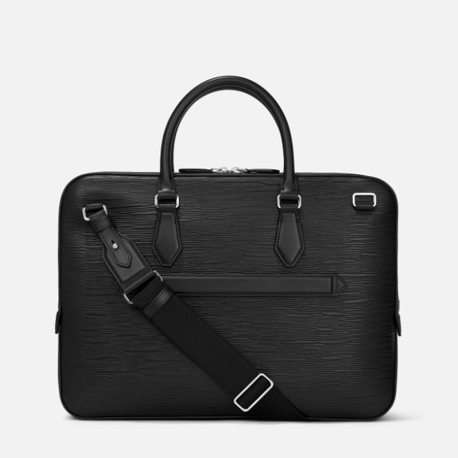 Elegante en toch ruim, deze slanke documententas is gemaakt van bewerkt leer met boomschorsmotief en biedt plaats aan tal van zakelijke benodigdheden, waaronder elektronische apparaten en A4-documenten. Als u het hoofdvak opent, ziet u twee open vakken en twee speciale vakken voor schrijfinstrumenten. De handgrepen van de tas zijn vervaardigd van gewoon leer en de opzet is geïnspireerd door de penpunt van de vulpen.