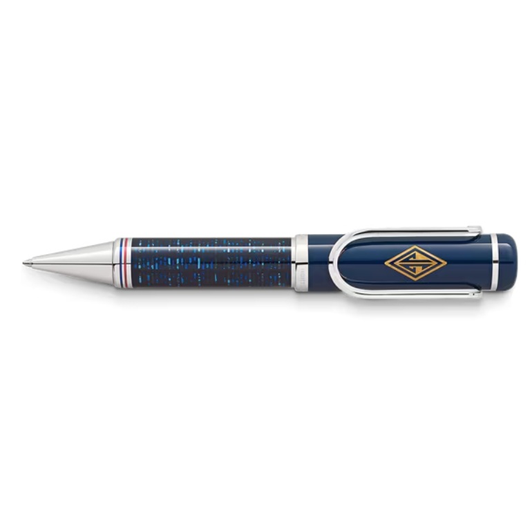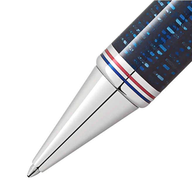 Het oppervlak van de houder, gemaakt met een speciale techniek, lijkt het oogverblindende New York van het Gatsby-tijdperk te weerspiegelen met fonkelende wolkenkrabbers in de blauwe avondlucht. De dop is gemaakt van resin, edelhars, wat contrasteert met de platina-plated fittingen. De platina-plated clip heeft de vorm van een geldclip. Bovendien sieren de letters ‘JG’, de initialen van Jay Gatsby, de dop als een ruitvormig, goudkleurig Art Deco-monogram. Het fluorescerende Montblanc-embleem in de bovenkant van de dop vangt en bewaart het licht overdag, zodat het in het donker oplicht, de kegel aan de top van de houder stelt de gegraveerde schroefdop van de stijlvolle heupflesjes uit de Art Deco-periode voor. De mythe van de Amerikaanse droom wordt verwezen door de fijne ringen in de kleuren van de Amerikaanse vlag op de kegel.