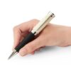 De Montblanc Writers Edition Homage to Robert Louis Stevenson is opgedragen aan deze fantasierijke verhalenverteller. De roman “Treasure Island” inspireerde veel ontwerpdetails van de editie. De algehele vorm van het schrijfinstrument en de ringen op de kegel zorgen samen voor de indruk van een historische, uitschuifbare verrekijker. De zwarte houder van kostbare edelhars is versierd met gegraveerde kruisen, waaronder een grotere “X”, zoals degene die de locatie van de schat op een kaart aangeeft. Verticale lijnen die doen denken aan de planken van de schoener “Hispaniola” en een traditionele zeekist sieren de dop van de Writers Edition. Achter de met platina beklede clip komen de lijnen samen in een kompasroos, terwijl de clip de vorm heeft van een zekeringspin, waaraan de lijnen van de tuigage van een schip zouden worden vastgemaakt. De bovenkant van de dop wordt bekroond door het Montblanc-embleem, versierd met het piratensymbool, een schedel en gekruiste beenderen, verhoogd in het midden. De dopring is versierd met een gravure van de handtekening van Stevenson naast de publicatiedatum van zijn eerste werk “The Pentland Rising”, 1866. De jaren van het leven van Robert Louis Stevenson, 1850-1894, zijn op de dop gegraveerd.