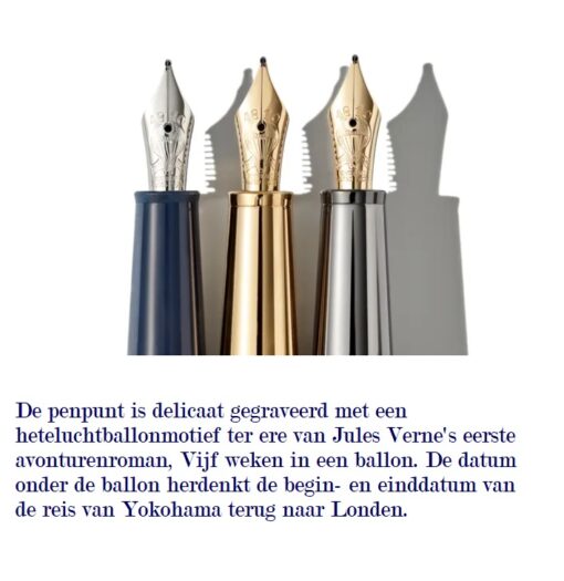 Wat weer opvalt aan deze bijzondere pen is de handgemaakte 14K gouden penpunt met daarop gemarkeerd 14/11 en 21/12, een herinnering aan Mr. Fogg’s vertrek uit Yokohama op 14 november en zijn ambitieuze plan om op 21 december terug te keren naar de Londense club om de weddenschap te winnen. Het is ook versierd met een afbeelding van een heteluchtballon, een verwijzing naar Jules Verne’s eerste avonturenroman.
