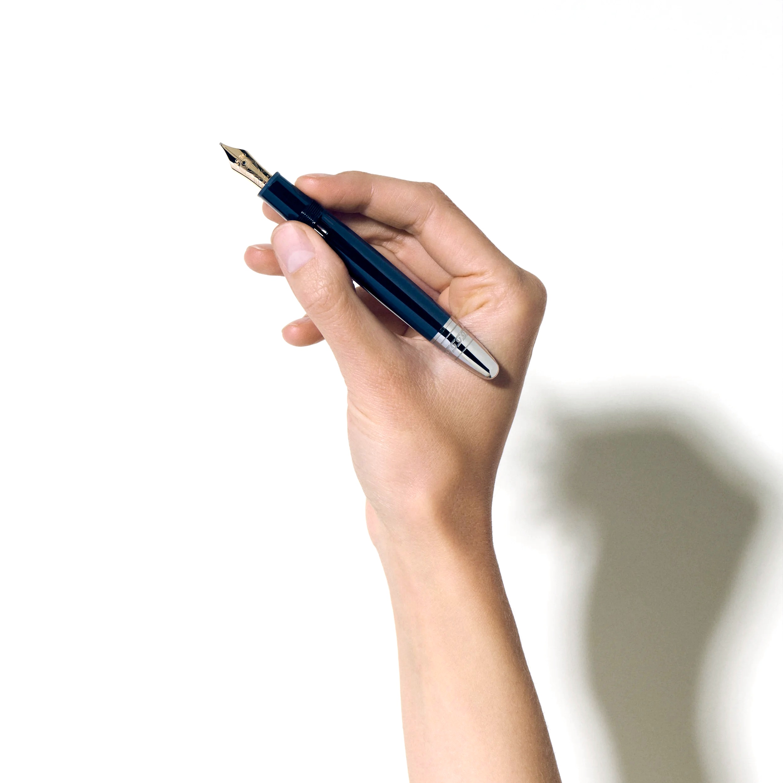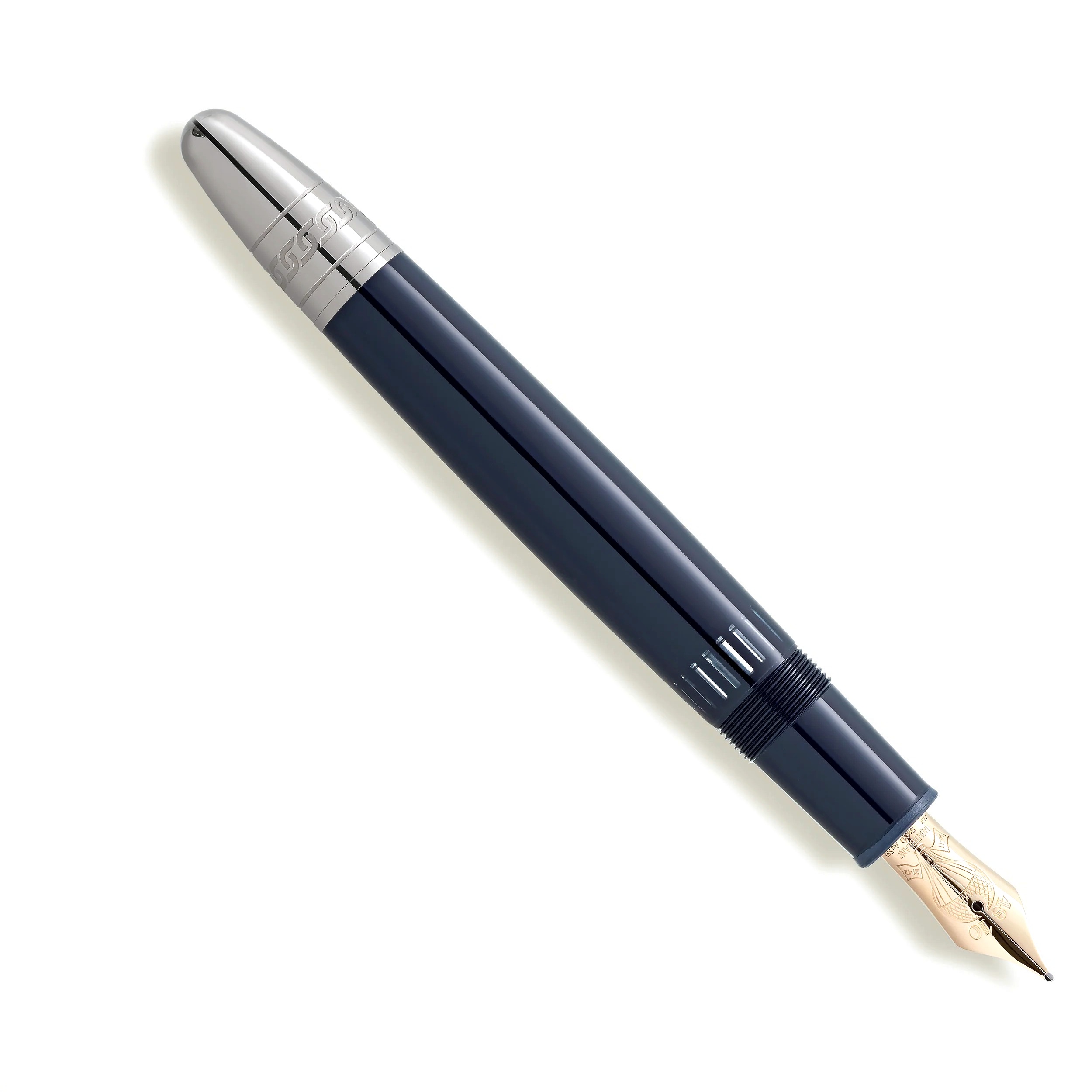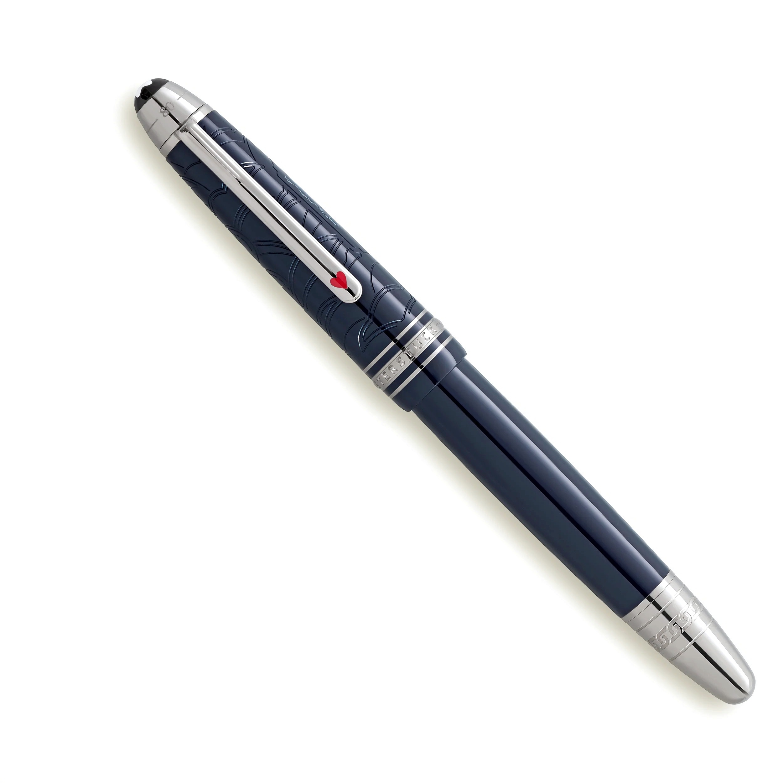 De LeGrand-vulpen, versierd met donkerblauwe edelhars, vertelt over de epische reis van Mr. Fogg en Passepartout. Het duo begint aan het laatste stuk van Yokohama terug naar Londen via de Verenigde Staten en doorkruist het uitgestrekte Amerikaanse continent per trein. Duik in de ingewikkelde details: een trein die elegant op de dop is gelaserd, een veiligheidskettingpatroon op de kegel, dat een cruciaal moment weerspiegelt waarop Passepartout de trein loskoppelt van de locomotief om de bemanning te redden die door Sioux is aangevallen. Het ontwerp van de dop legt drukventielen en de opstijgende rook van de locomotief vast, terwijl de clip een rood gelakt hartkaartpak heeft, dat de verbintenis tussen Phileas Fogg en prinses Aouda symboliseert. Bovendien vertegenwoordigen de kaartpakken Foggs gewaagde weddenschap om de reis in slechts 80 dagen te voltooien. De bovenkant van de dop draagt de reliëftijdlijn van de reis, 36 dagen van Yokohama naar Londen, met als hoogtepunt het totaal van 80 dagen rond de wereld.