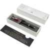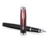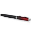 vulpen van messing, overdekt met mat zwarte lak en de dop uitlopend van zwart naar rood. Deze pen heeft een stalen penpunt en schrijft met patronen of converter en inktpot