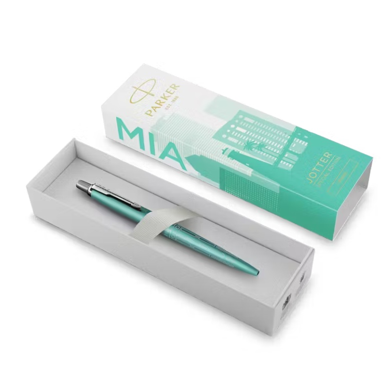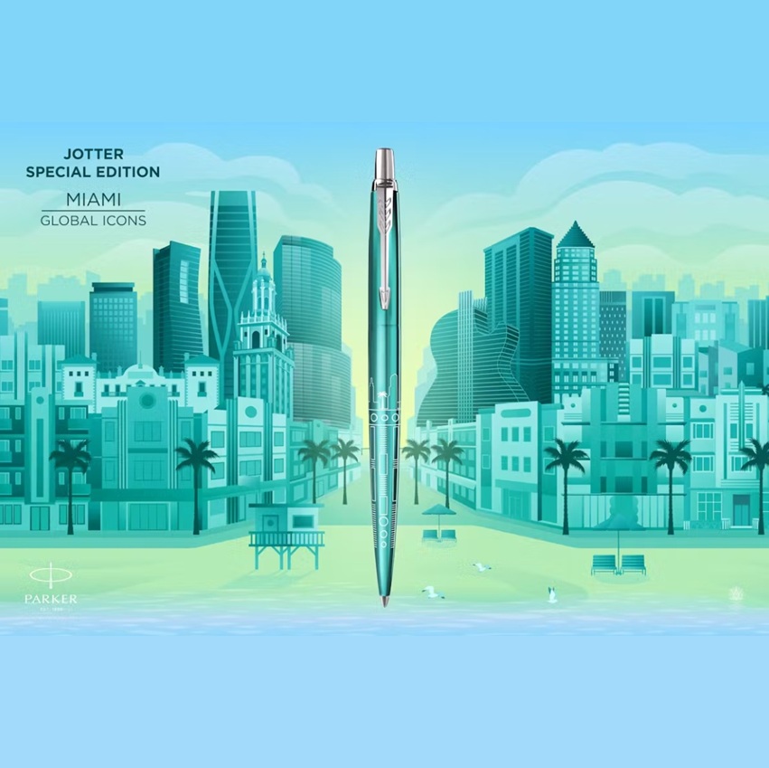 Geïnspireerd door Miami’s levendige Art Deco-gebouwen, legt deze unieke Jotter uit de nieuwste ‘Global Icons’ Special Edition-serie de geest van de speelse, kleurrijke architectuur van de stad vast. Het vakkundig gelaserde skyline-ontwerp en de turquoise gelakte afwerking zijn mooie voorbeelden van Parker-vakmanschap, dat de Jotter een niveau van verfijning geeft dat je van hoogwaardige pennen mag verwachten.