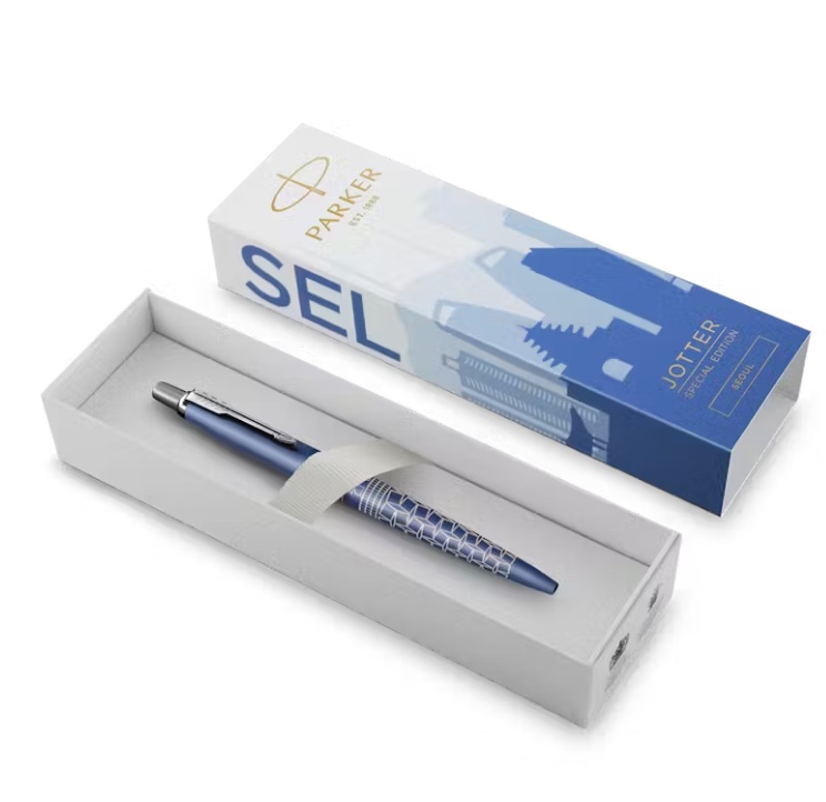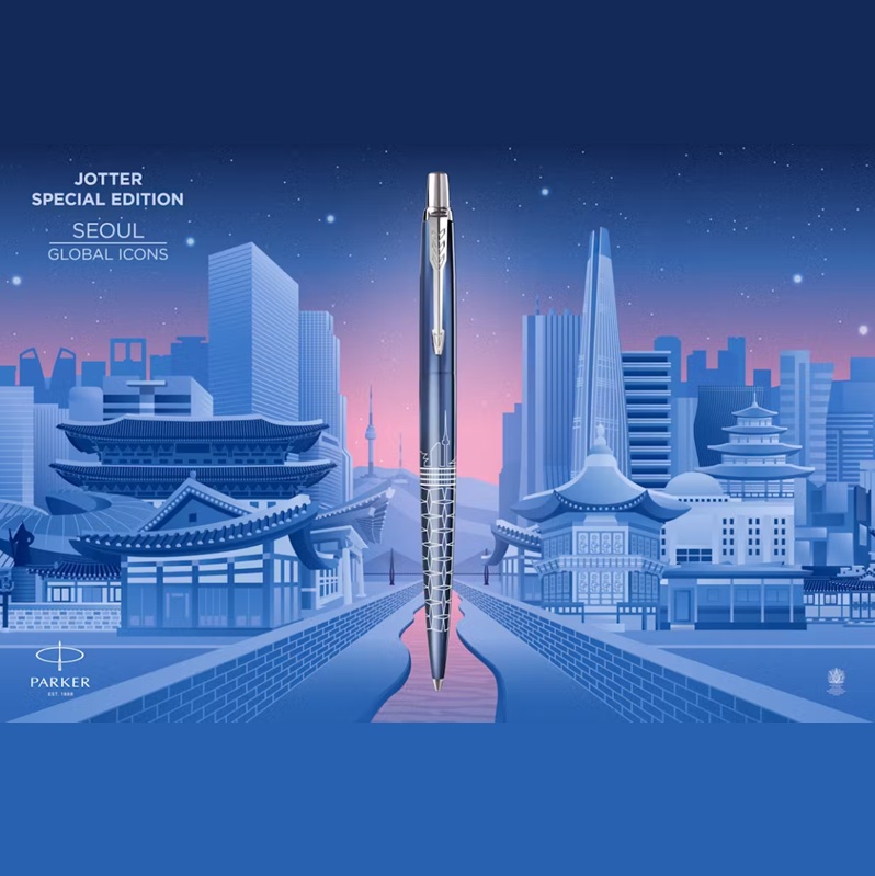 De betoverende en dynamische sfeer van een stad bij zonsondergang vormt de inspiratie voor de Jotter Special Edition Seoul. Het verlichte schouwspel van de vele iconische en futuristische bezienswaardigheden, de strakke wolkenkrabbers en verbluffende innovatieve bouwwerken van de stad, vormen samen het unieke patroon. Als blijk van Parker’s vakmanschap is het ontwerp vakkundig in de houder van dit verfijnde schrijfinstrument gelaserd. De indigo gelakte afwerking, de soepele schrijfervaring en de kenmerkende klik van de Jotter maken de kwaliteiten van de pen compleet. Voor elke reiziger die op reis gaat naar verfijnd schrijven, zal de Jotter Special Edition Seoul de weg wijzen.