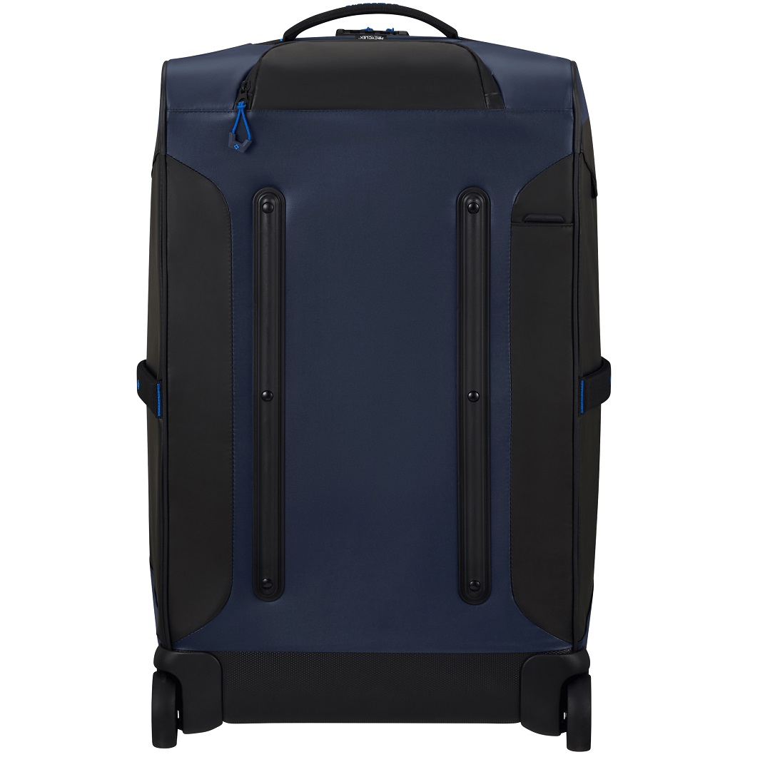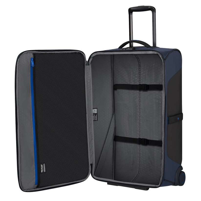 De stof aan de buiten- en binnenkant van Ecodiver zijn gemaakt met minstens 95% gerecycleerde petflessen, wat deel uitmaakt van ons Recyclex™ Material Technology Initiative. Er zijn 4 tot 47 gerecycleerde flessen (0,5l) gebruikt om jouw Ecodiver te vervaardigen. Daarnaast is de zwarte boordstof gemaakt met 95% gerecycleerd nylon van industrieel afval. De voering is ‘solution dyed’, wat betekent dat het verfproces van de stof werd overgeslagen, waardoor er minder water en verf wordt gebruikt. De coating en de versterkende stof aan de achterkant zijn gemaakt van nieuwe materialen. Meer te weten komen over duurzamere initiatieven van Samsonite? Lees hier ‘Our Responsible Journey’ strategie.