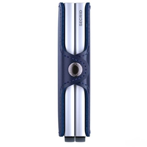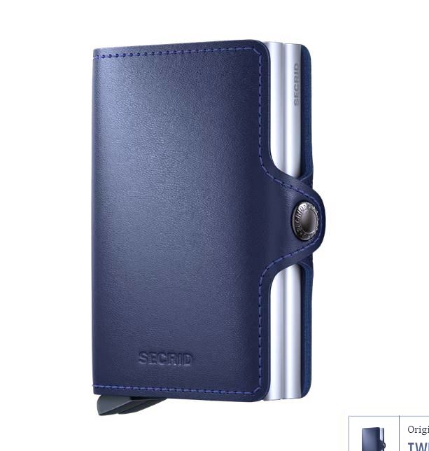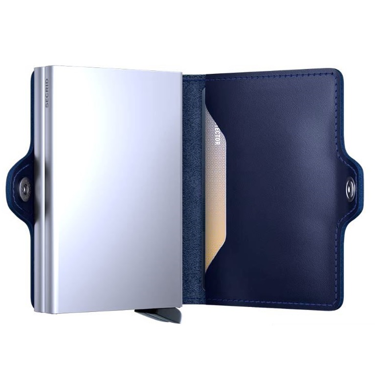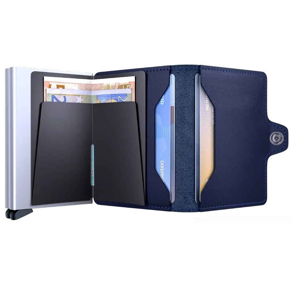 De Twinwallet bestaat uit twee Cardprotectors in een leren hoes met druksluiting. Met de Twinwallet neemt u acht tot twaalf kaarten beveiligd mee. Het binnenwerk biedt daarnaast ruimte voor extra kaarten, papiergeld, bonnetjes, visitekaartjes en muntgeld. De aluminium Cardprotector maakt het mogelijk om kaarten met één simpele beweging uit te schuiven en ze te beschermen tegen buigen, breken en ongewenste draadloze communicatie (RFID-safe).