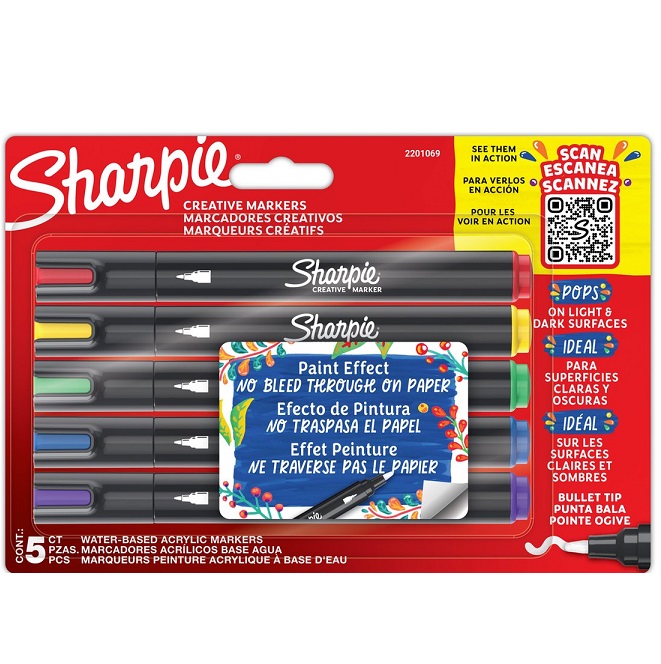 Fijne dekkende markers, set van 5: paars, rood, geel, blauw en groen. Geschikt om te werken op papier, metaal, hout, glas, keramiek, steen, canvas. Creatieve markers in diverse levendige kleuren die niet doorlopen met speciale kwastachtige punt.